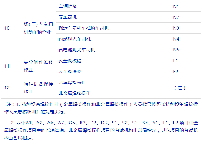 特種設備安全管理人員、叉車司機、起重機司機、起重機指揮、壓力容器、鍋爐、氣瓶充裝、電梯安裝與維修、觀光車、客運索道操作與修理、大型游樂設施操作與維修等等。